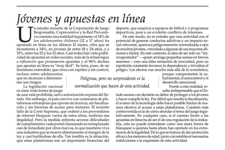 Editorial El Mercurio: Jóvenes y apuestas en línea